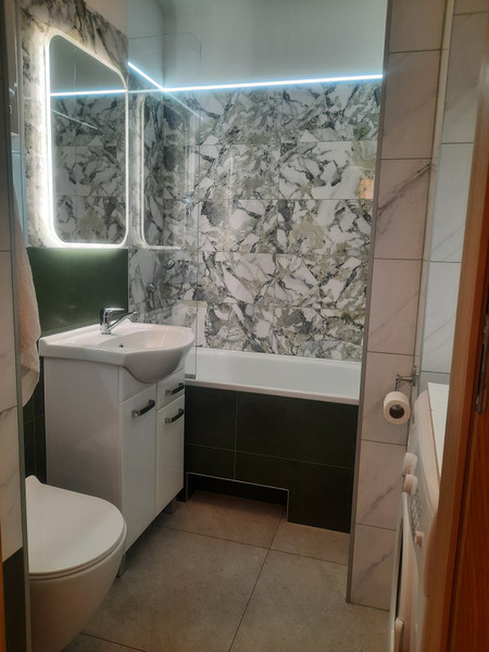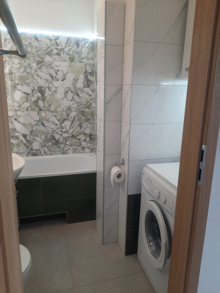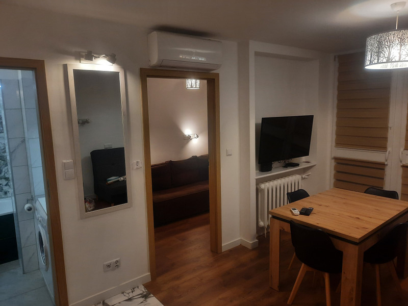 Umeblowane: kanapa, wersalka, stół (blat 80x120cm, rozkładany do 160 cm), 4 krzesła, lodówka, płyta gazowa, nowoczesny piekarnik elektryczny, okap, pralka, szafa wnękowa z lustrami. Ekran tv na wysięgniku na ścianie (w większym pokoju), Netflix, internet, VOD. Spokojni i kulturalni sąsiedzi.