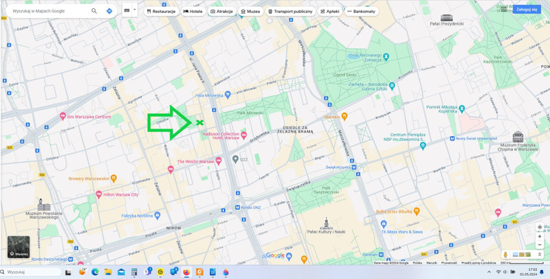 Do metra "Rondo ONZ" – 600 m, do metra "Świętokrzyska": 1300 m, najbliższe przystanki: 220 m (tramwaje: 17, 19, 25, 33, autobusy: 160, 4 linie nocne) do skrzyżowania ul. Jana Pawła II z al. Solidarności 550 m. W bloku: sklepy Biedronka i Żabka, lunch restaurant "Przysmaki Podlasia". W pobliżu restauracje, hala Mirowska.