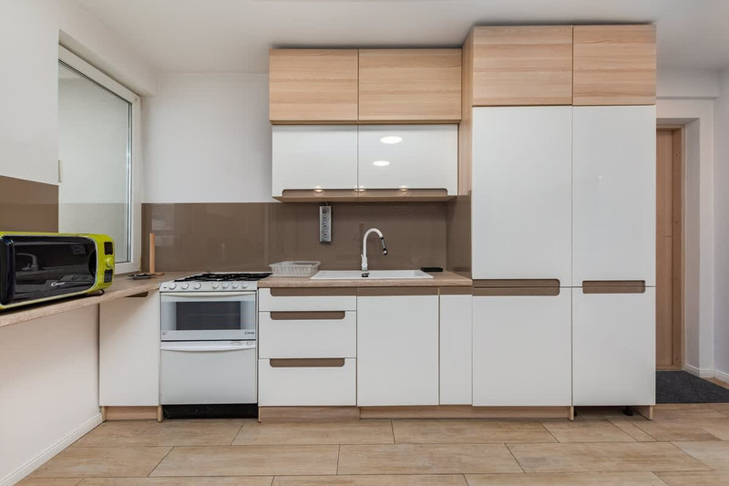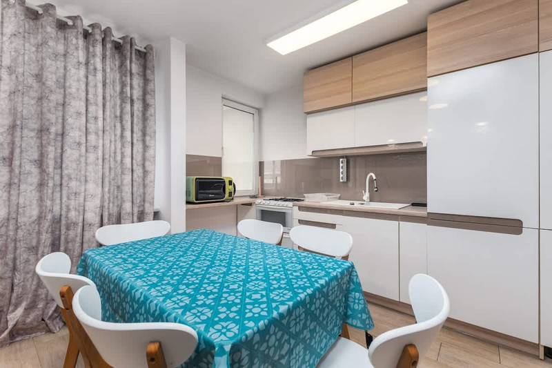 Kuchnia: lodówka, piekarnik, kuchenka, zmywarka, mikrofalówka, czajnik elektryczny, naczynia i sztućce, garnki, patelnie.