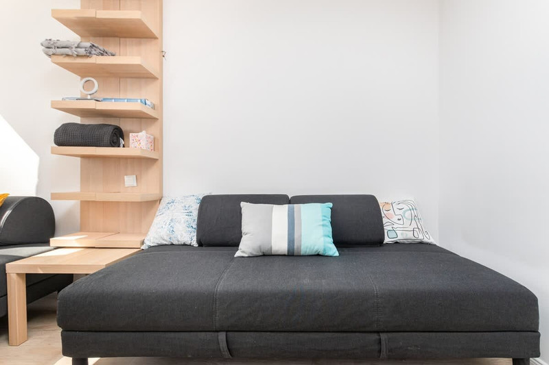 Salon: rozkładana 2-osobowa sofa, stół z krzesłami, szafki, TV.