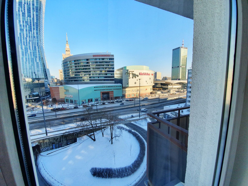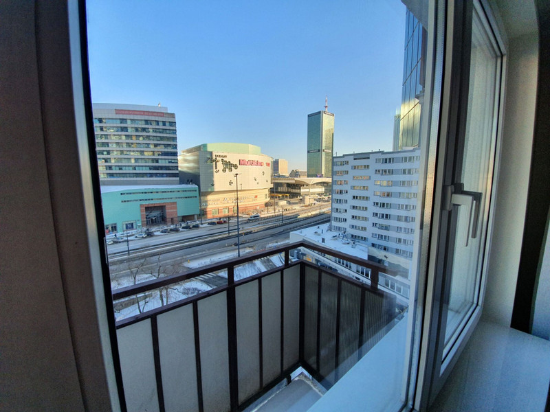 Okna wychodzą na wschodnią część budynku (widok z okien i balkonu na Pałac Kultry i Złote Tarasy)