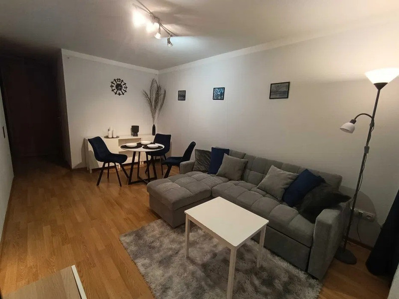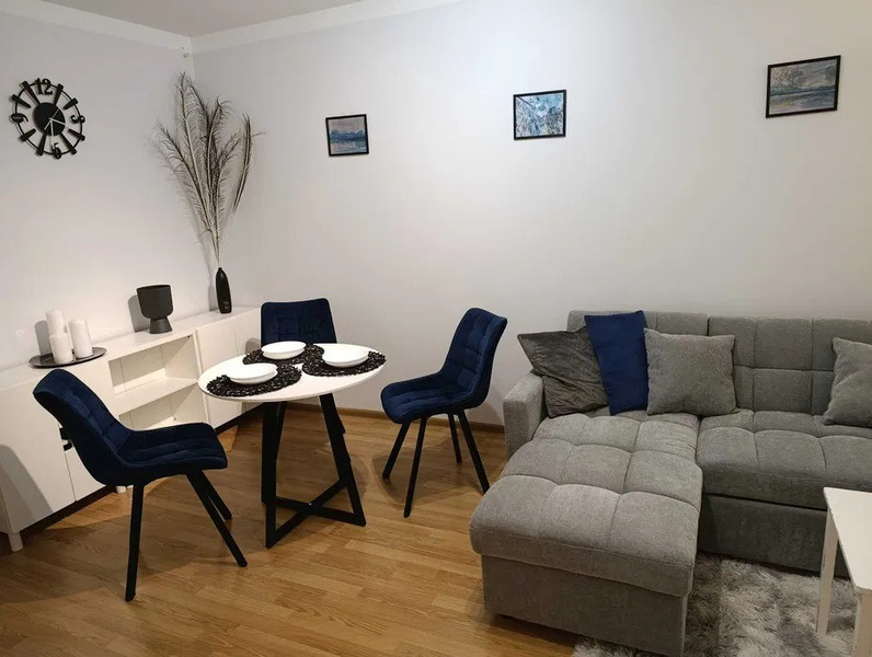 Mieszkanie składa się z przestronnego pokoju, w którym znajduje się narożnik, ława, szafka tv, komoda i stól z krzesłami. Z salonu wchodzi sie do sypialni w której jest łozko 140 cm z materacem, oraz biurko. Kuchnia wyposażona jest w kuchenkę gazową z piekarnikiem, lodówkę oraz zmywarkę. W przedpokoju znajduje się duża, pojemna szafa. Łazienka oferuje wannę, umywalkę, WC, szafki oraz pralkę.