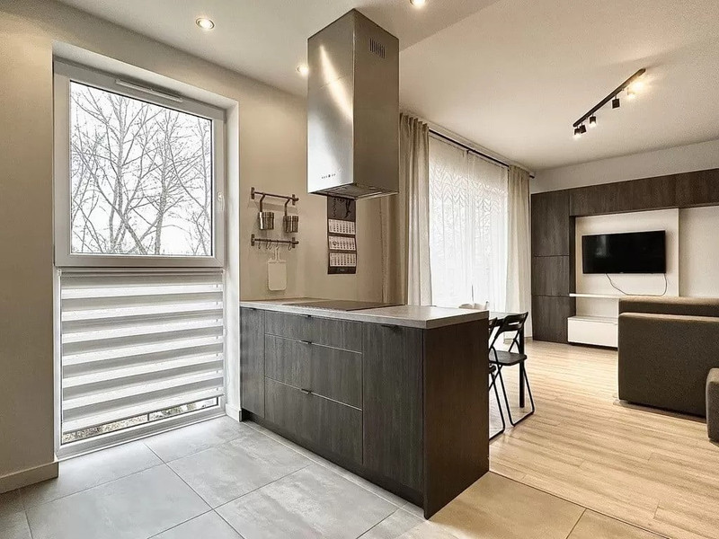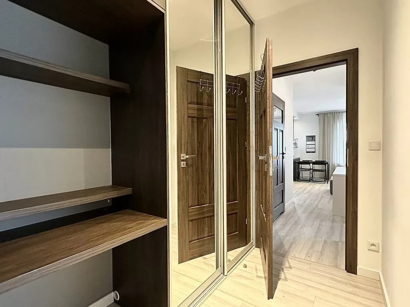 Składa się z otwartej, widnej kuchni w zabudowie i sprzętem AGD, salonu z wyjściem na duży balkon, dwóch sypialni, w tym jedna z wydzielonym miejscem do pracy przy komputerze, oraz dużą szafą z lustrem.