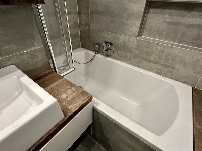 Łazienka z wanną, szafkami i zabudową w której stoi pralka i suszarka. Przedpokój z szafą wnękową.