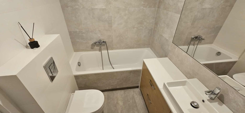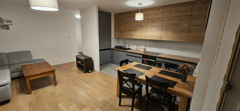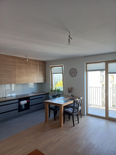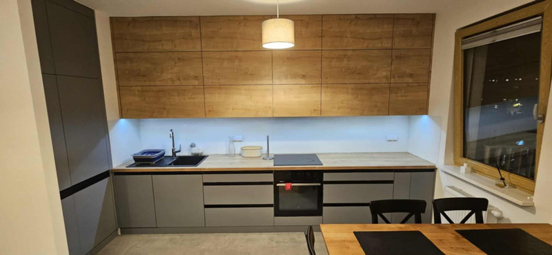 Mieszkanie w pełni wyposażone w sprzęt wysokiej jakości: pralka, zmywarka, piekarnik itd., meble kuchenne pod wymiar z dużą ilością przestrzeni do przechowywania.