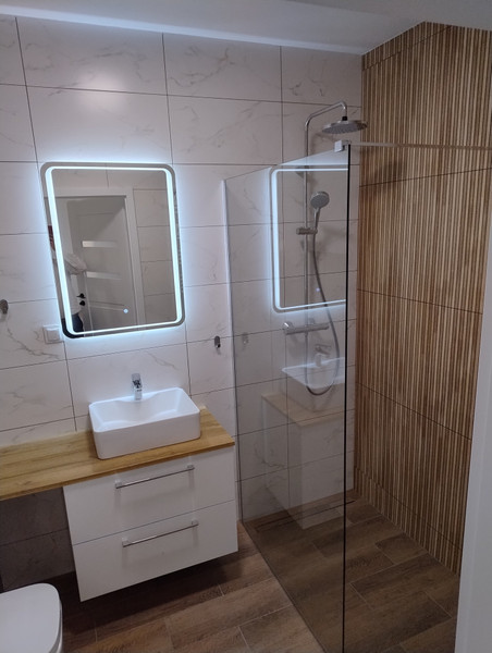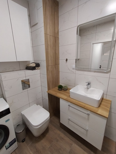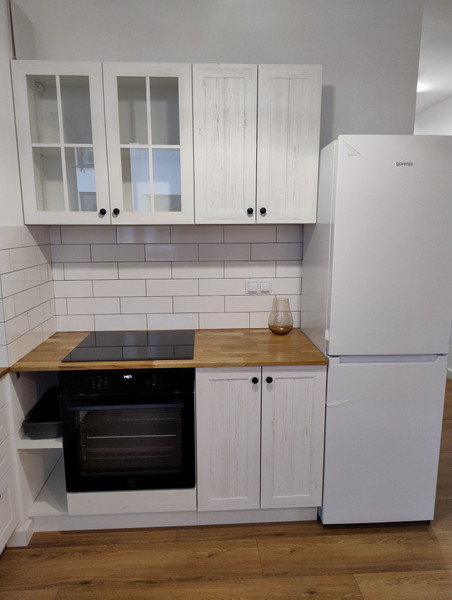 Podłoga z paneli winylowych. W kuchni blat drewniany (dębowy) oraz nowy sprzęt AGD (Electrolux-zmywarka, piekarnik, płyta indukcyjna; Gorenje - lodówka No Frost). W łazience pralka Electrolux, komfortowy prysznic walk-in z odpływem liniowym.