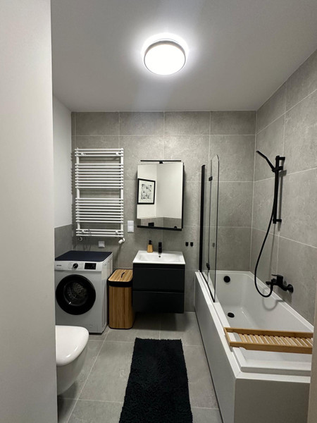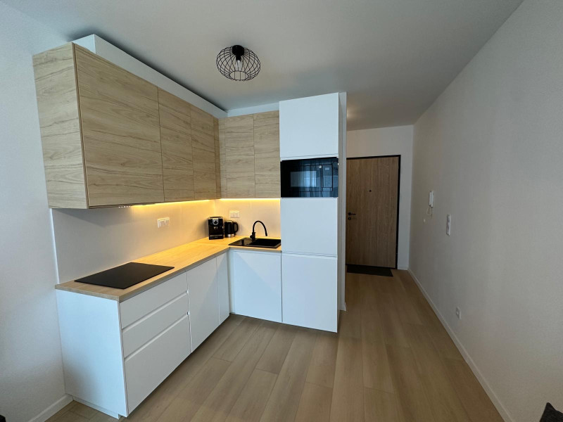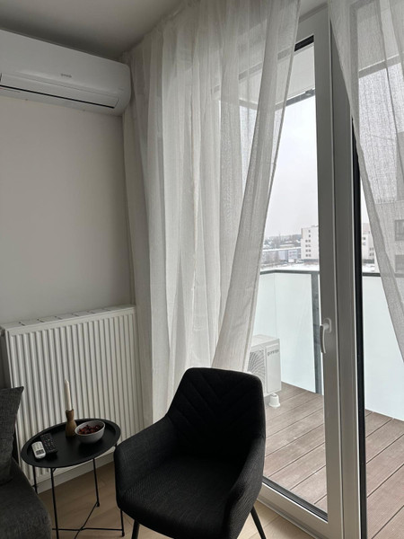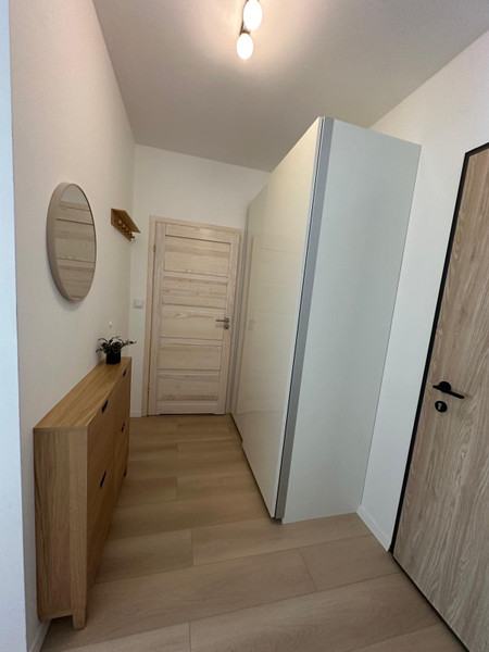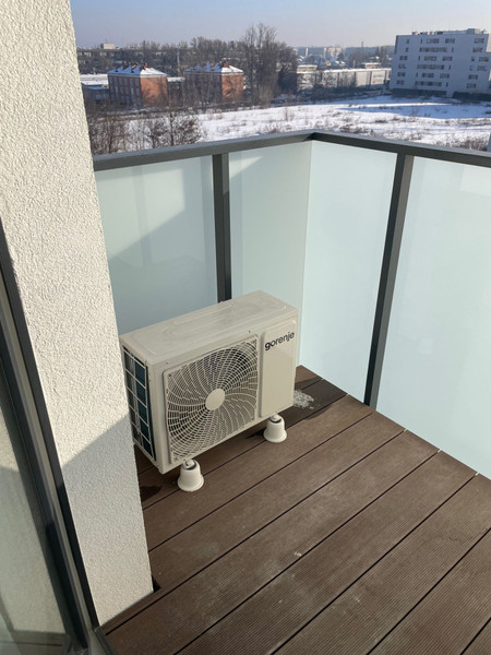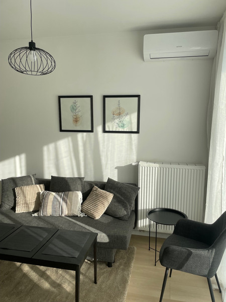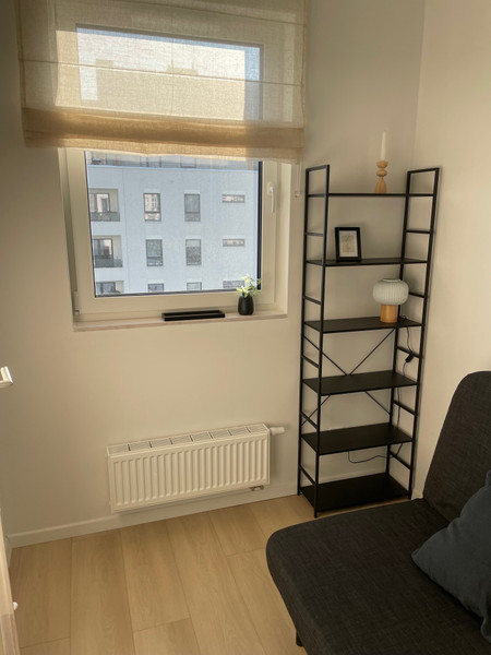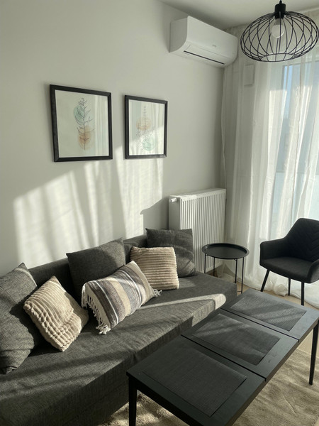 Mieszkanie jest w pełni umeblowane, wyposażone w klimatyzację, nowe AGD i wszystkie potrzebne kuchenne akcesoria. Aneks kuchenny (wyposażony w płytę indukcyjną, okap, zmywarkę, mikrofalówkę, lodówkę, żelazko, odkurzacz bezprzewodowy, czajnik i express do kawy), łączy się z przytulnym salonikiem (wyposażonym w kanapę, stolik, komodę oraz telewizor z dekoderem odbierający 44 kanały telewizji internetowej ). Z saloniku jest wejście do sypialni i na balkon. Wygodna łazienka jest wyposażona w wannę z parawanem szklanym i nową pralkę. Mieszkanie jest jasne, z południową ekspozycją, z rozległym widokiem na centrum Warszawy. Mieszkanie posiada wentylację mechaniczną z filtrami powietrza. Mieszkanie jest urządzone w stylu boho - sporo drewna, jasne naturalne kolory.