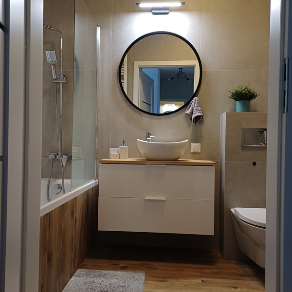 W łazience wanna z parawanem, wc, szafka z umywalką, lustro, pralka Amica i szafka ścienna do przechowywania.