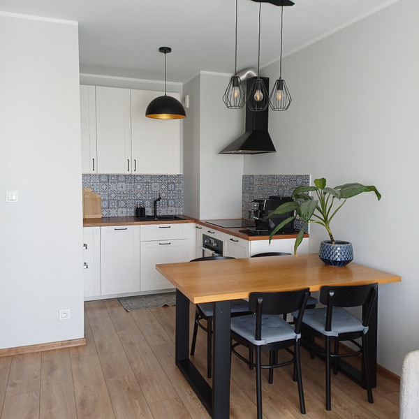 Kuchnię od salonu oddziela stół z 4 krzesłami.