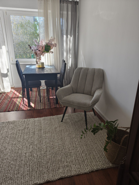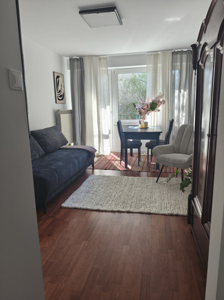 Mieszkanie 49m położone jest na terenie osiedla Niedźwiadek, w otoczeniu drzew i skwerów, na pierwszym piętrze. Okoliczne budynki mieszkalne położone są w znacznej odległości, inaczej niż na oszczędnych w zieleń, nowoczesnych osiedlach. Lokal jest dwustronny i składa się z jasnego dużego pokoju z balkonem, osobnej kuchni, 2 dodatkowych pokoi, łazienki oraz osobnej toalety. Każdy z mniejszych pokoi może zostać z łatwością zaaranżowany jako odrębne sypialnie, pokoje dziecięce lub gabinet. Kuchnia wyposażona jest w pełni wyposażona, w tym w zmywarkę, piekarnik oraz kuchenkę gazową. Mieszkanie w ostatnim czasie przeszło gruntowny remont a na okoliczność wynajmu dodatkowo zostało odmalowane i odświeżone. Blok oraz okoliczne budynki otoczone są starodrzewiem a okna wychodzą wprost na zieleń. W każdym z 3 pokoi przewidziano miejsce do przechowywania oraz szafy na ubrania. W szerokim korytarzu znajdują się szafka na buty, wieszaki na okrycia wierzchnie, lustro i wygodny stolik. Duży pokój jest wyposażony w zabytkową i odrestaurowaną szafę oraz oryginalny, drewniany stół. Kanapa z funkcją spania, fotel i krzesła w salonie są nowe. Znajduje się tutaj także nowoczesny telewizor. Podłączone są telewizja kablowa oraz internet. Istnieje możliwość dokupienia łóżek do pozostałych pokoi. Kuchnia wyposażona jest w nowe naczynia, kubki, szklanki, patelnię, czajnik, deski do krojenia. Została także zaopatrzona w startowy pakiet porządkowy: płyn do mycia naczyń, sól i płyn do zmywarki, mydło do rąk, ręczniki papierowe, gąbki do zmywania. W mieszkaniu znajdują się także zestaw mopujący i klasyczny odkurzacz.