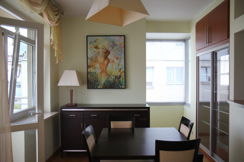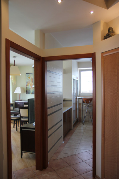 Mieszkanie całkowicie urządzone. Kuchnia częściowo otwarta na salon. W przedpokoju i garderobie duże, zabudowane szafy.