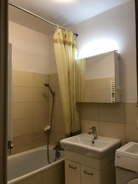 Łazienka z wanną, pralką i umywalką. Oddzielne WC.