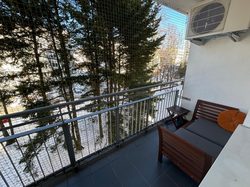 Z salonu wyjście na przestronny balkon (loggia) z widokiem na korony drzew, tworzące naturalną zasłonę względem budynku naprzeciwko.