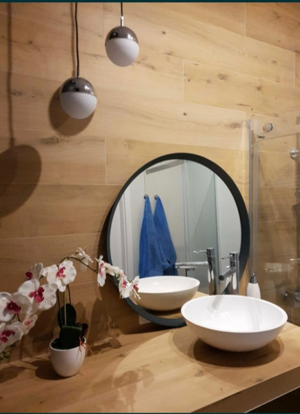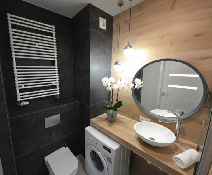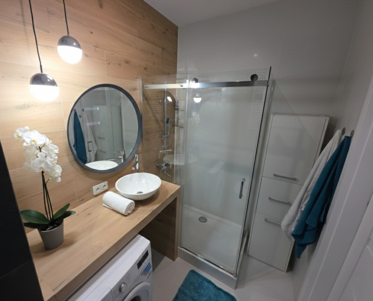 Łazienka (4,4 m²) z przestronną kabiną prysznicową i deszczownicą, pralką, szafką na ręczniki, umywaką, WC.