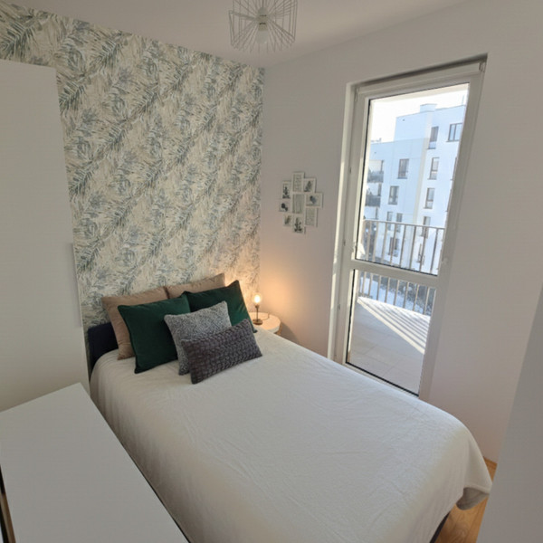 Sypialnia (5 m²) z dużą szafą, komodą, łóżkiem i wyjściem na loggię 3,4 m²-widok na jeziorko