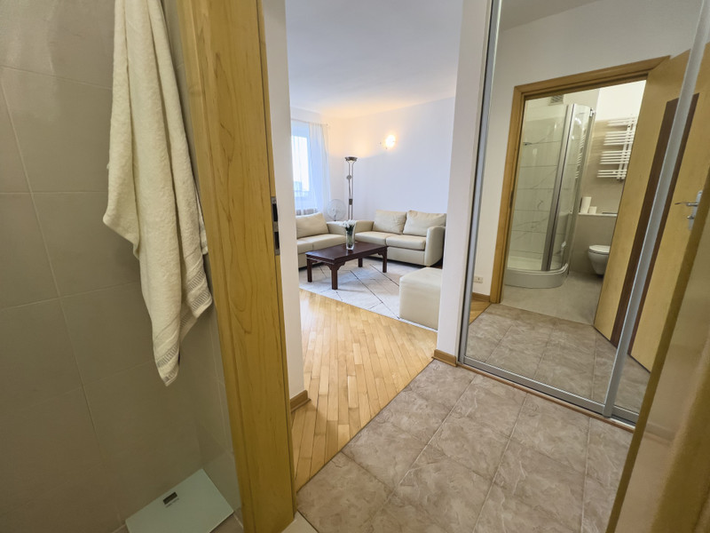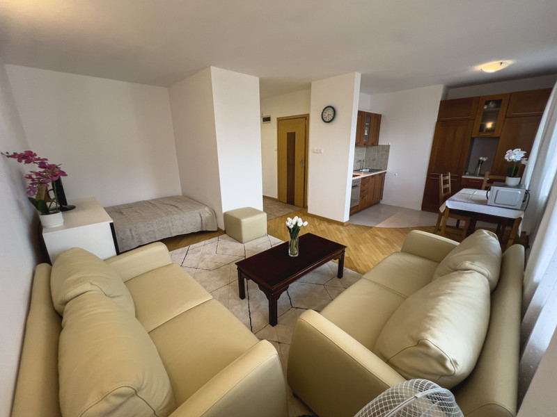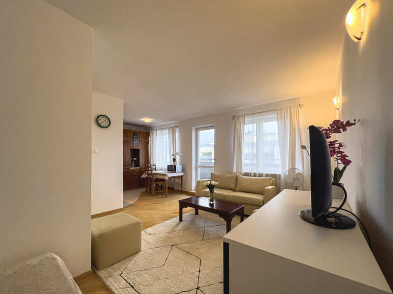 Części kuchennej - w pełni wyposażonej; salonu/sypialnii; przedpokoju - z dużą szafą w zabudowie z lustrami; łazienki oraz dużego balkonu.