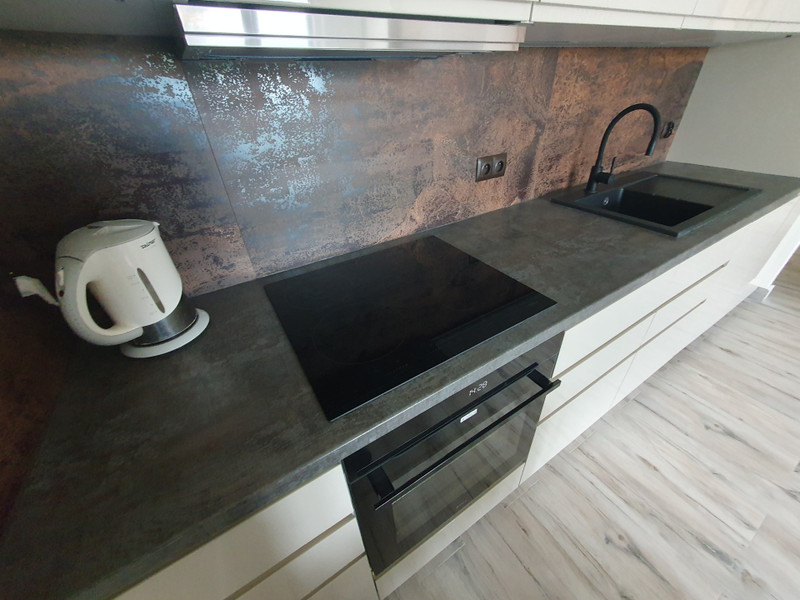 • Pokój dzienny z aneksem kuchennym w pełni wyposażonym (lodówka, piekarnik, zmywarka, płyta indukcyjna), z wyjściem na obszerny balkon, z którego rozciąga się widok na przestrzeń leśną