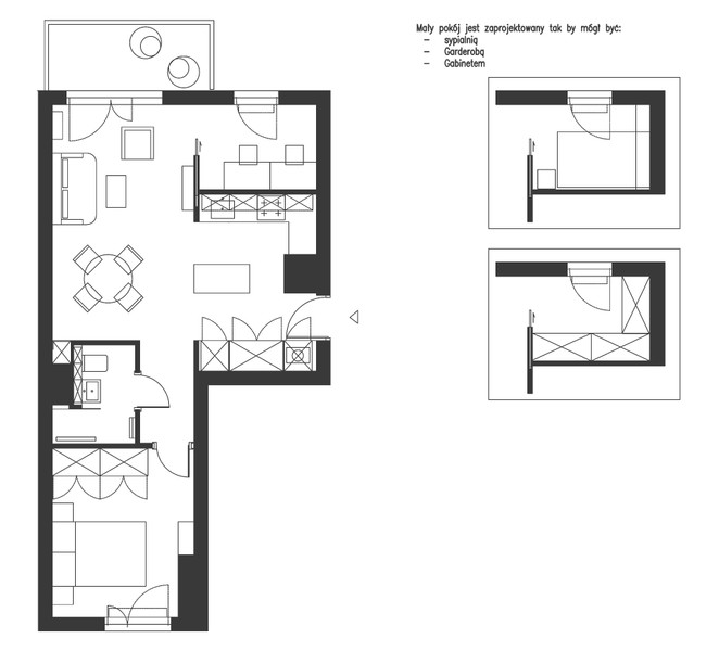 - Dodatkowy pokój z przesuwnymi drzwiami – idealny jako druga sypialnia, gabinet lub garderoba, w zależności od potrzeb.