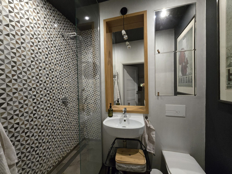 - Łazienka z dużymi przeszkleniami i nowoczesnym, otwartym prysznicem.