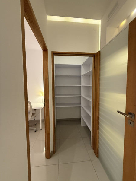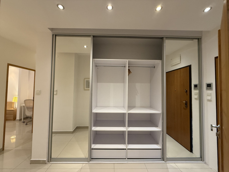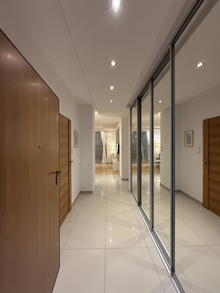 • Przestronny korytarz (ok. 8 m²) – duża, pojemna szafa pełniąca funkcję garderoby; dodatkowo wydzielone miejsce na deskę do prasowania, żelazko i inne akcesoria.