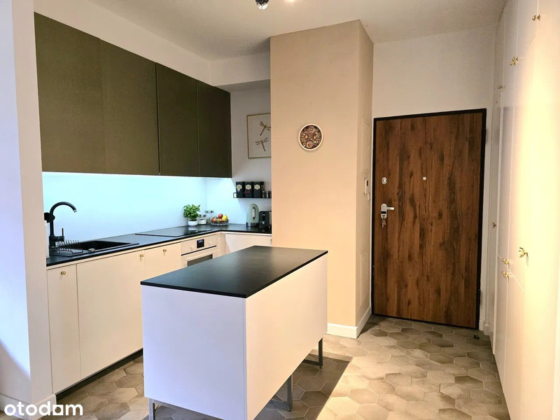 - Kuchnia w bocznym aneksie – w pełni wyposażona, funkcjonalnie połączona ze strefą wejściową. Dużo miejsca do przechowywania.