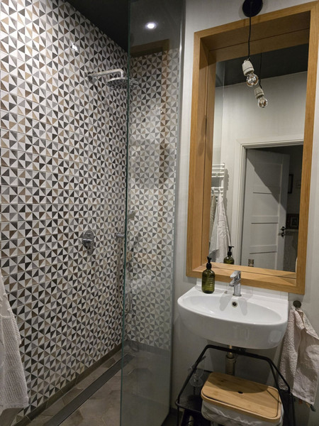 - Łazienka z dużymi przeszkleniami i nowoczesnym, otwartym prysznicem.
