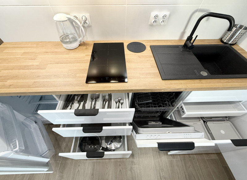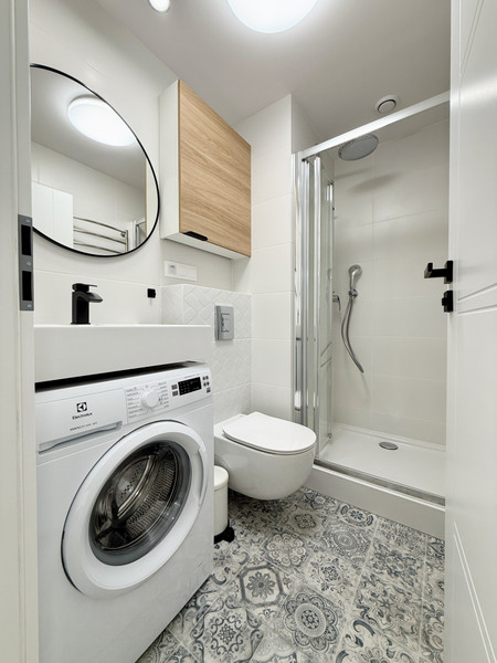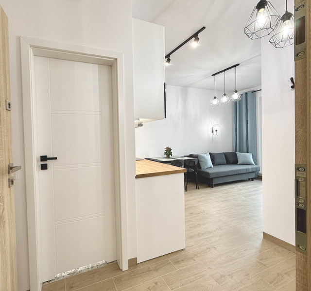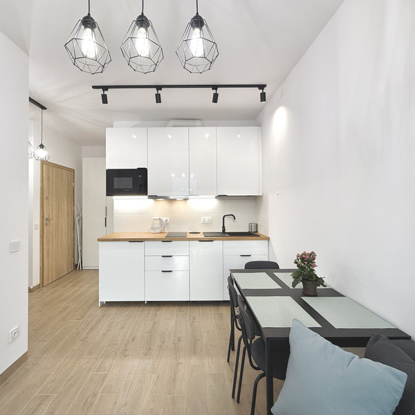 Mieszkanie w pełni wyposażone i umeblowane oraz wyposażone w sprzęt AGD. Kuchnia otwarta na salon. Rozkładana kanapa, trzy szafy, komoda, stół i krzesła. Zmywarka, lodówka, mikrofala z grillem, czajnik elektryczny, talerze, garnki i sztuce, odkurzacz, pralka, deska do prasowania, żelazko.