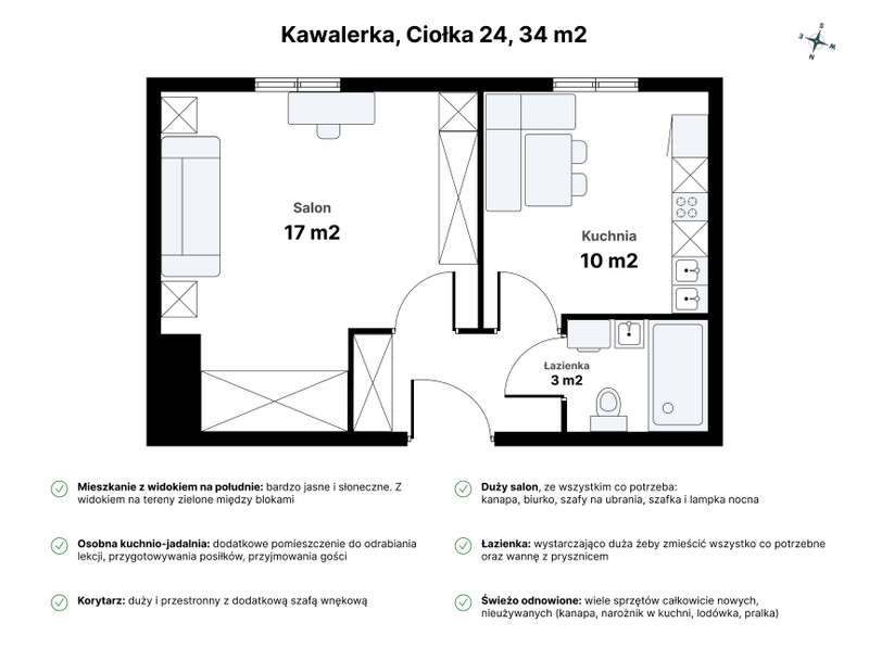 – duży salon (17 m2) z nową, nieużywaną kanapą, biurkiem, szafami i półkami. Przestronne, nowocześnie urządzone wnętrze. Idealne zarówno dla jednej osoby jak i pary.