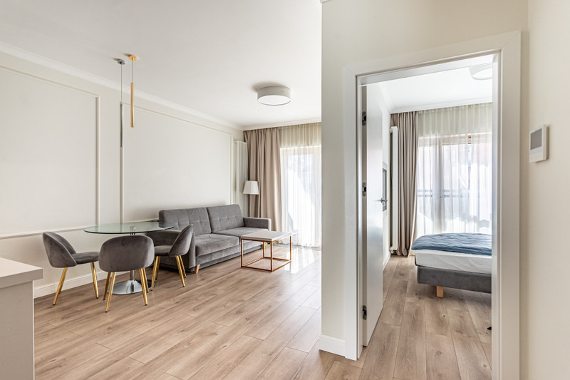 Zaprojektowany i urządzony przez architekta wnętrz w wysokim standardzie. Eleganckie i komfortowe wnętrze utrzymane w stonowanej kolorystyce. z klimatyzacją.