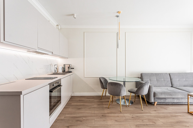 Mieszkanie wyposażone w sprzęt AGD dobrej jakości, w tym lodówkę, zmywarkę, płytę indukcyjną, piekarnik, pralkę.