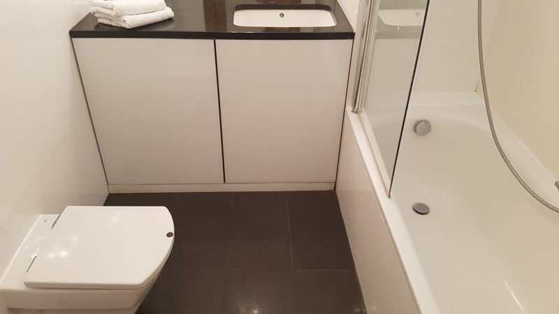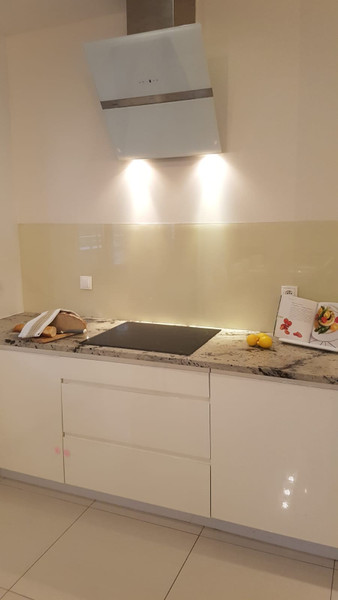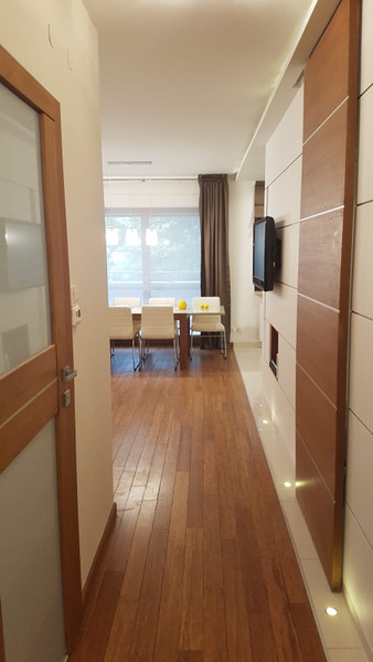 Mieszkanie składa się z salonu połączonego z kuchnią, z którego jest wyjście na taras (14 m2). W salonie sofa, stół z krzesłami. Kuchnia umeblowana wraz ze sprzętem AGD(lodówka, zmywarka, płyta, okap, piekarnik). Łazienka z wanną, WC, umywalką, pralką. W przedpokoju garderoba.