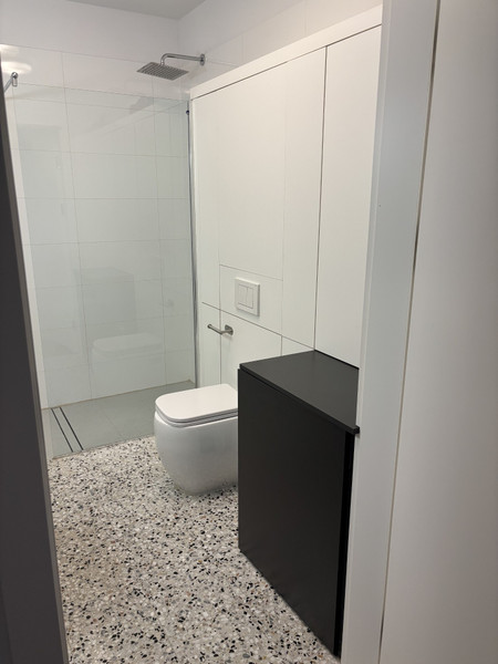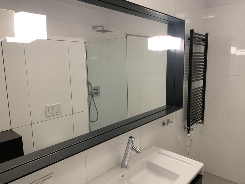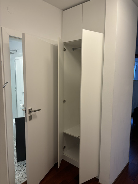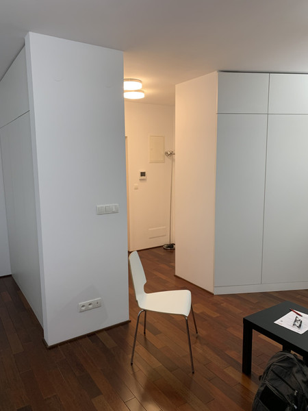 Składa się z dużego pokoju, z dwoma oknami balkonowymi, ( balkony tzw. francuskie )z kanapą, stolikiem, biurkiem, fotelem, krzesłem przy biurku, aneksu sypialnego z szafą w zabudowie na całą ścianę, dużego łóżka, szafki nocnej, aneksu kuchennnego - cała zabudowa robiona na zamówienie, sprzęt kuchenny ( zmywarka, piekarnik, kuchenka) wysokiej jakości, oraz łazienki z prysznicem, umywalką z dużym lustrem, i pralką. Oświetlenie firm włoskich. Drzwi antywłamaniowe.
