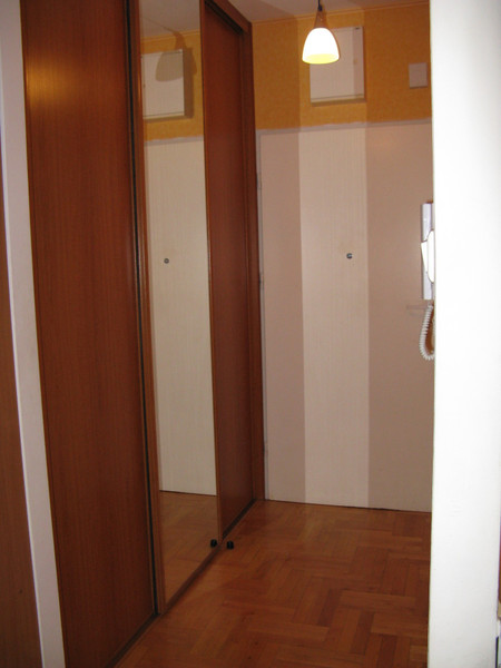 Przestronny pokój (kanapa, meble) z aneksem kuchennym (meble, kuchenka, lodówka) + łazienka (WC, wanna, pralka) + przedpokój (duża szafa wnękowa)