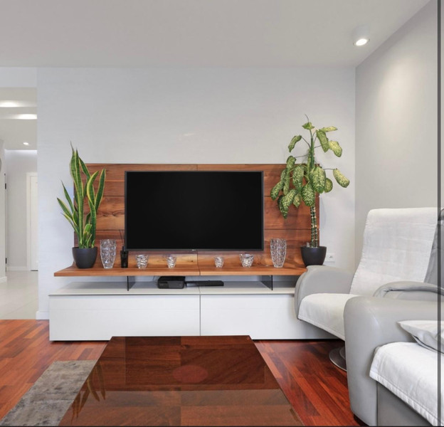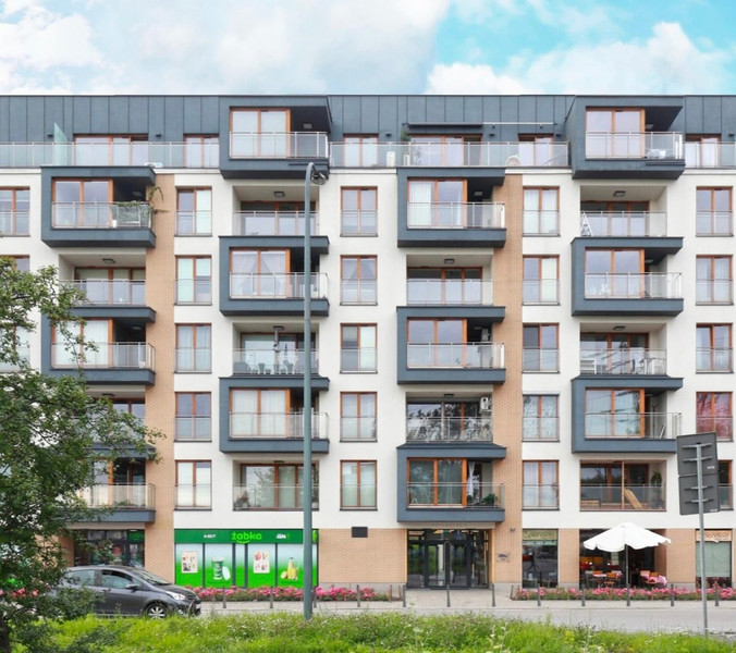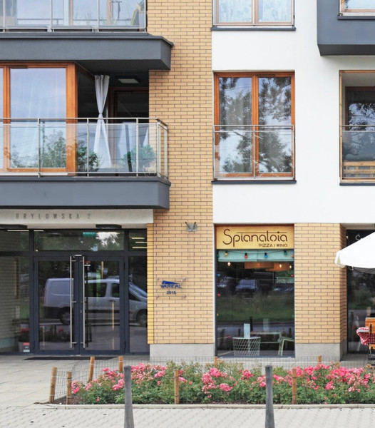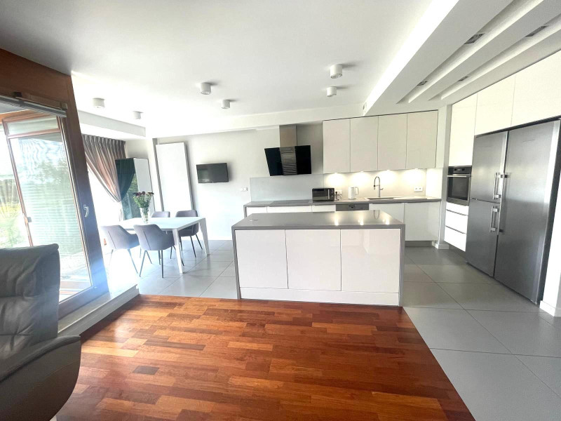 - Przestronny salon z częścią wypoczynkową, jadalnią i wyjściem na loggię