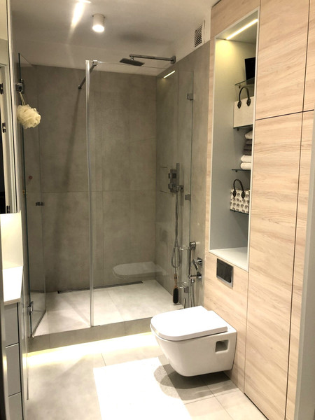 • łazienka z prysznicem oraz miejscem na pralkę.