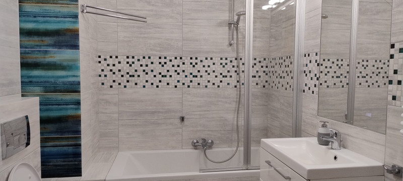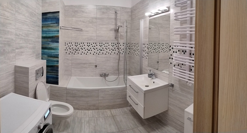- Łazienka (wanna z funkcją prysznica, pralka, wc, szafki)
