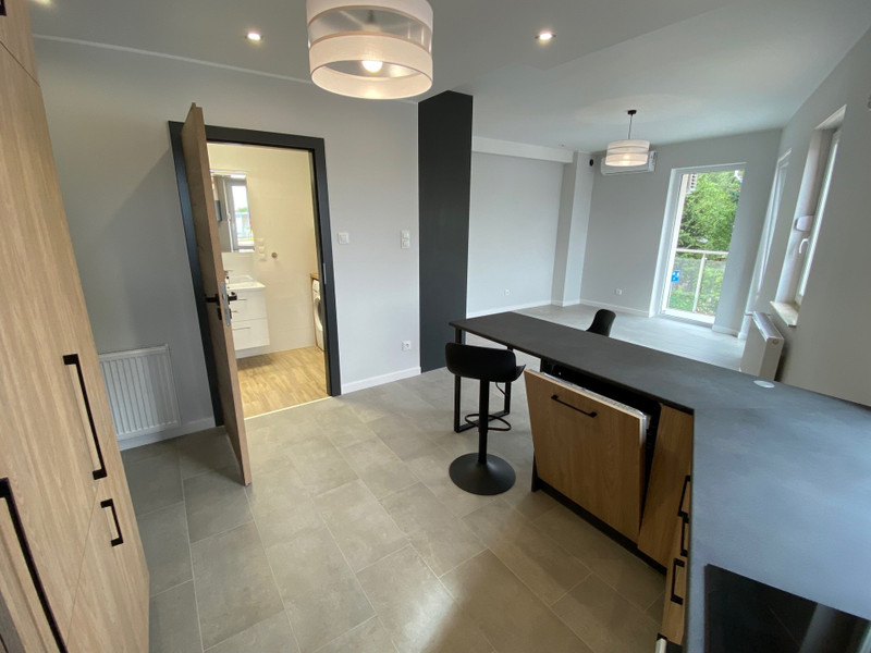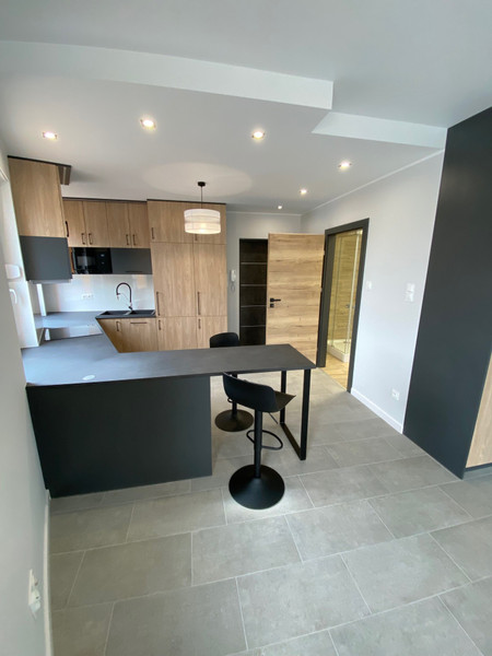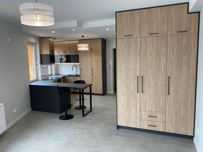 Rozkład mieszkania : Aneks Kuchenny - Pokój / lodówka, zamrażarka, piekarnik, mikrofala, okap, płyta indukcyjna , zlewozmywak , zmywarka , stół plus dwa krzesła , szafa na garderobę , klimatyzacja /