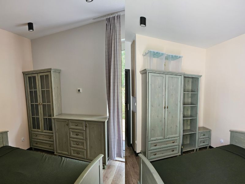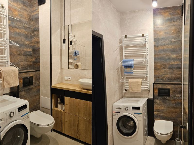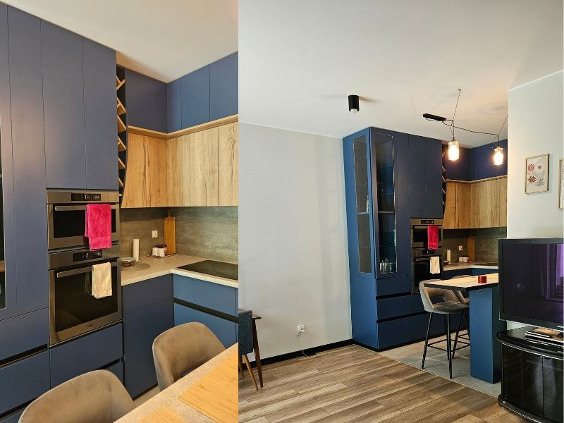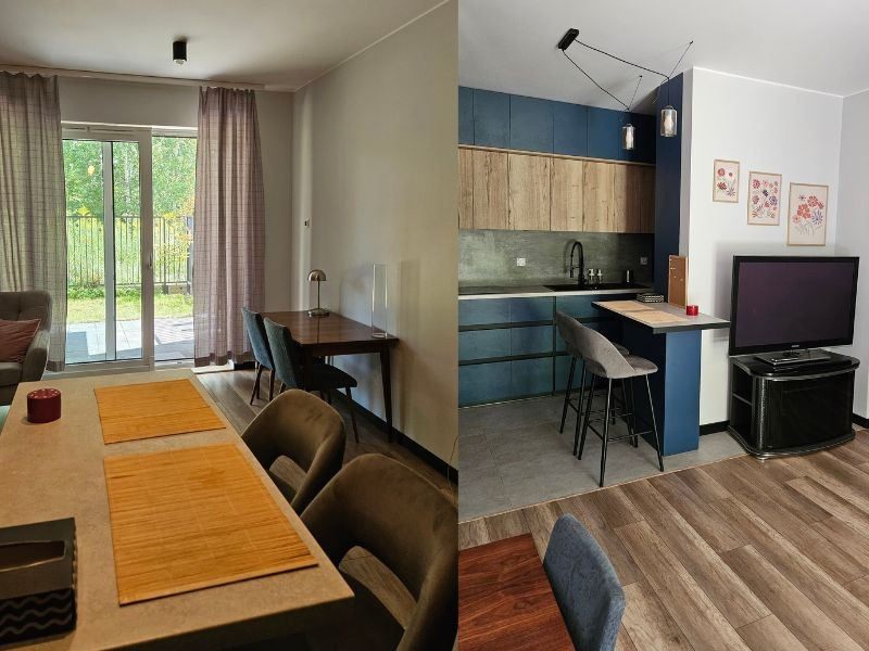 W pełni umeblowane, dostosowane ergonomicznie do osób wysokich. W kuchni posiada zabudowę do samego sufitu, dzięki czemu cała przestrzeń mieszkania zostaje wykorzystana.