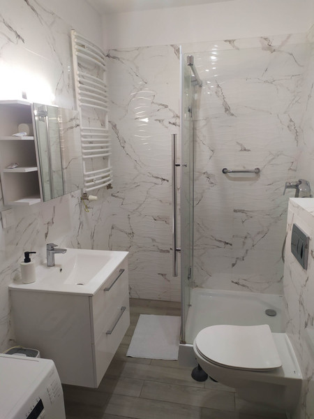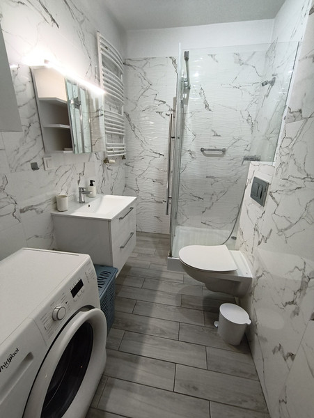 Mieszkanie jest umeblowane, w kuchni lodówka, zmywarka kuchenka elektryczna, w łazience pralka.