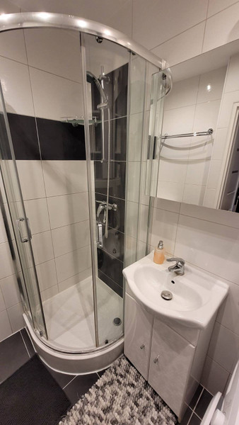 Łazienka z prysznicem i pralką – czysta, funkcjonalna, zadbana.