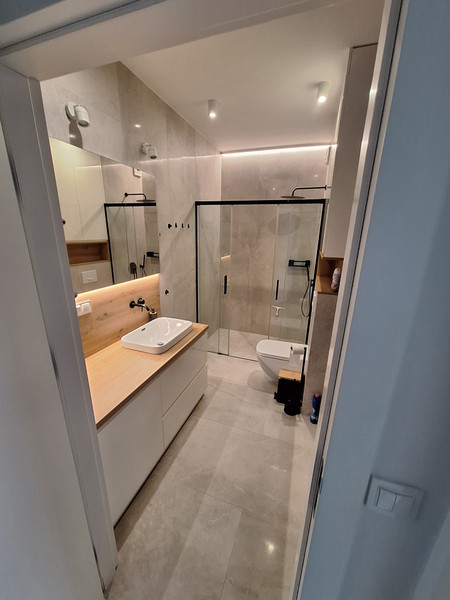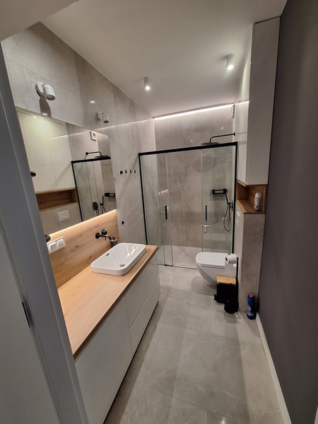 • Łazienka: stała zabudowa szafek, kabina prysznicowa, podstawowe wyposażenie łazienki,