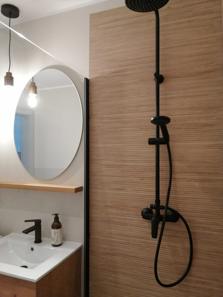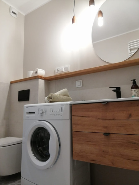 - łazienka z prysznicem i pralką