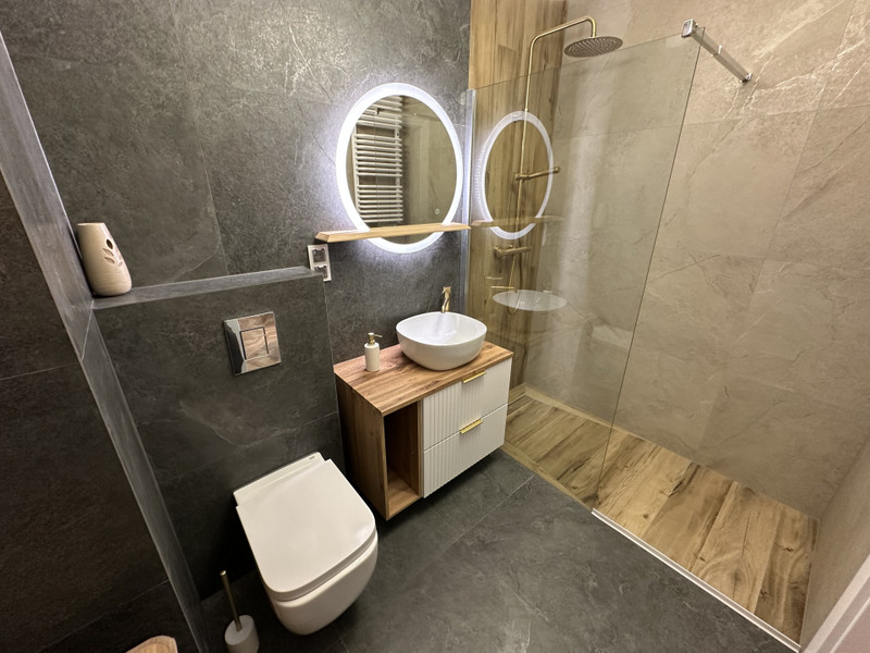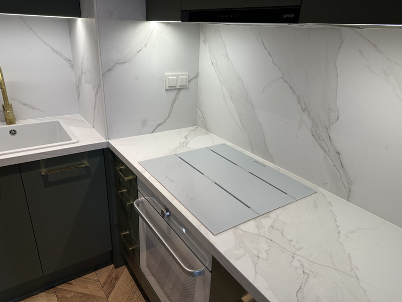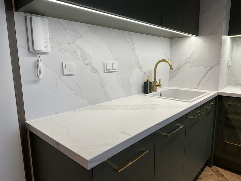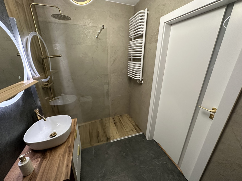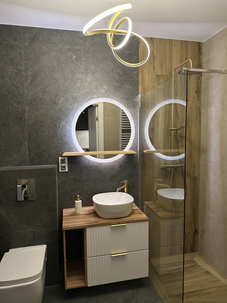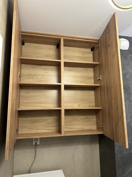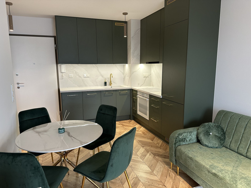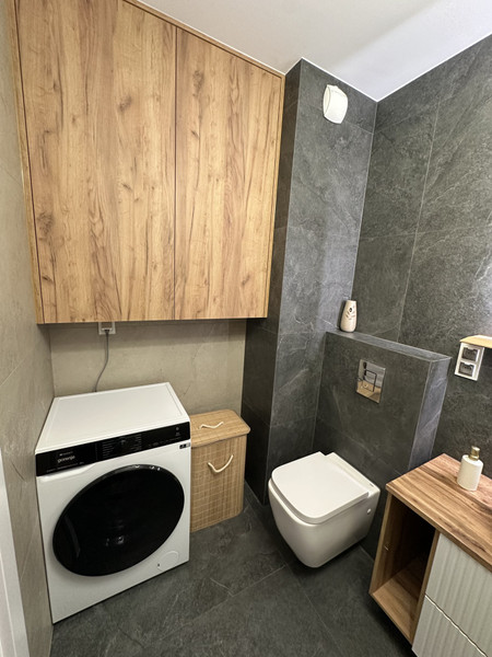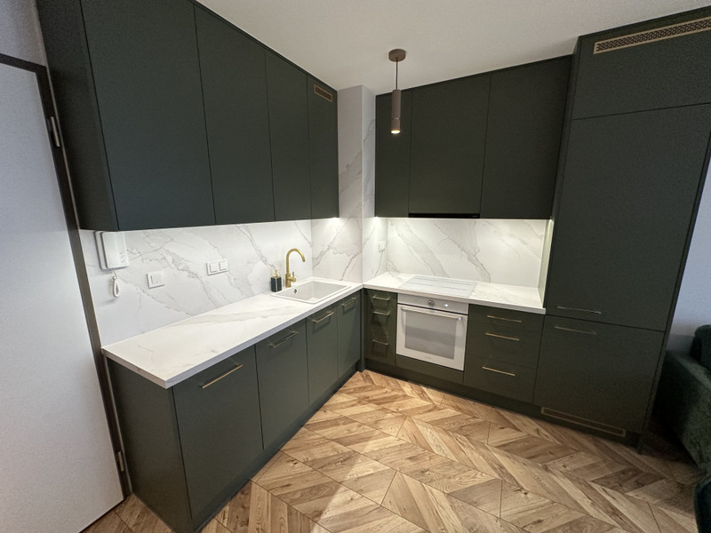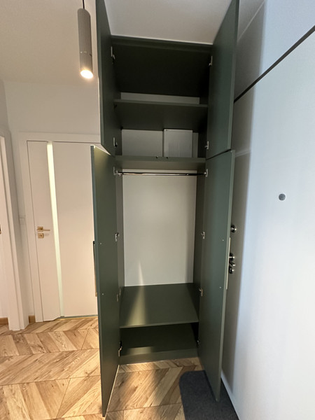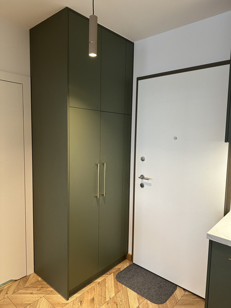 Mieszkanie zostało wykończone w wysokim standardzie, z dbałością o każdy detal. Zabudowy meblowe wykonane na wymiar przez stolarza zapewniają maksymalne wykorzystanie przestrzeni i komfort użytkowania.