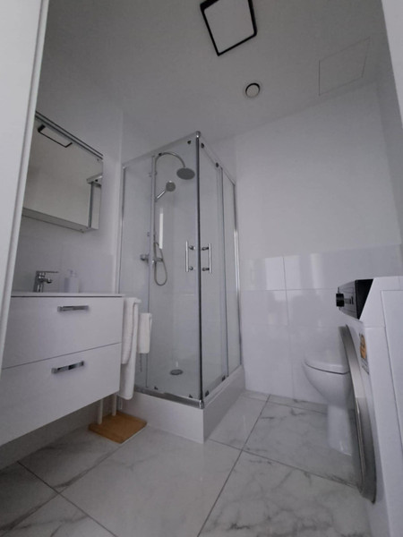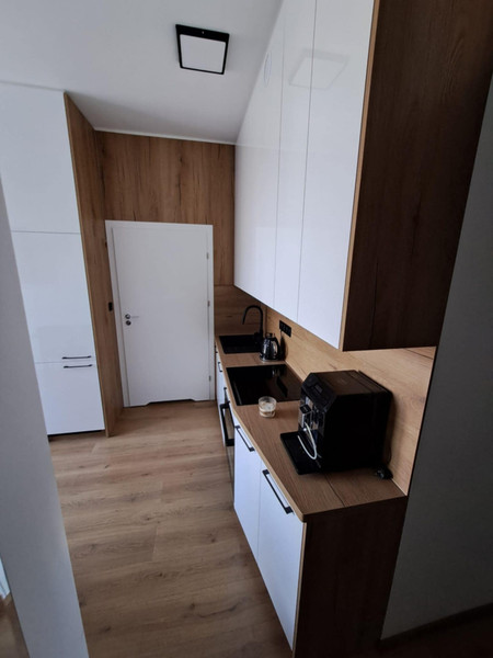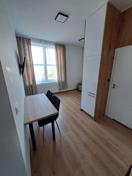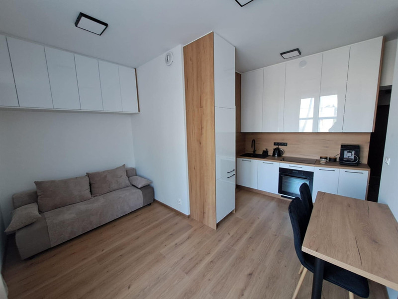 Mieszkanie 1-pokojowe zlokalizowane jest na pierwszym piętrze z oknami wychodzącymi na południowy - zachód. Mieszkanie z 2025 roku, wykończone w nowoczesnym stylu. W przestronnym, dobrze doświetlonym (dzięki dużym oknom) salonie z aneksem kuchennym o łącznej powierzchni 17,00m2 znajduje się 2-osobowa, rozkładana sofa oraz telewizor plazmowy(45 cali ). Kuchnię wyposażono w lodówkę, płytę indukcyjną, piekarnik, zmywarkę oraz express do kawy (krupsa ) .Dodatkowo kuchnia została wyposażona :sztućce, talerze, garnki, patelnie, szklanki, środki czystości. W łazience znajduje się kabina prysznicowa oraz pralka (Elektrolux)). W przedpokoju wstawiono dwie duże szafy z miejscami na ubrania wyjściowe (kurtki, płaszcze buty), jak i zwykłe - z wieszakami na koszule, półkami i szufladami na bieliznę. Dodatkowo znajdują się szafki wiszące na pościel, ręczniki itd,