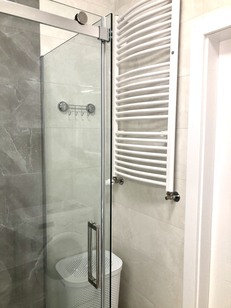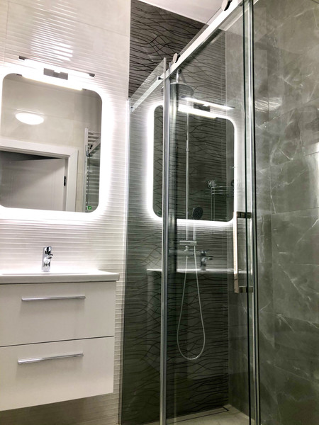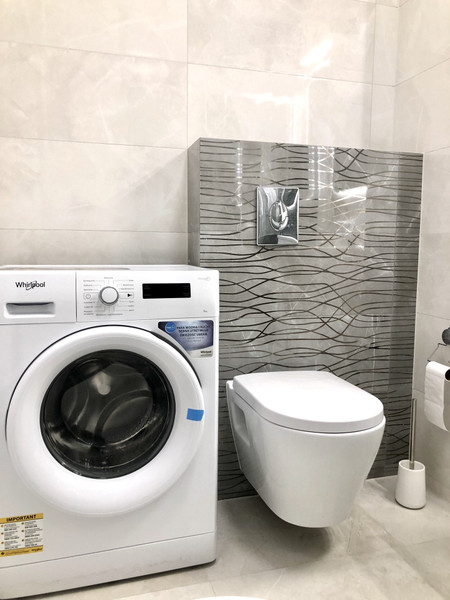 • nowoczesna łazienka z kabiną prysznicową i pralką