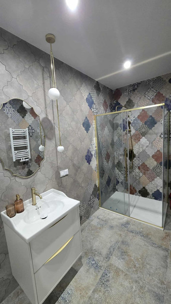 Łazienka wyłożona wysokiej jakości hiszpańskim gresem z dużym prysznicem i nową pralką.