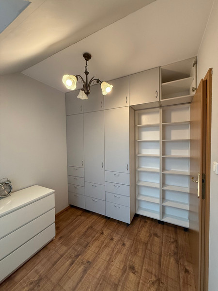 W sypialni znajduje się kolejna duża szafa oraz podwójne sypialniane łóżko z materacem i komodą.