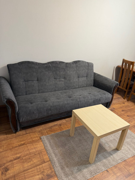 W salonie na najemcę czeka duża kanapa z funkcją spania, zabudowa meblowa, stół , 4 krzesła, TV.