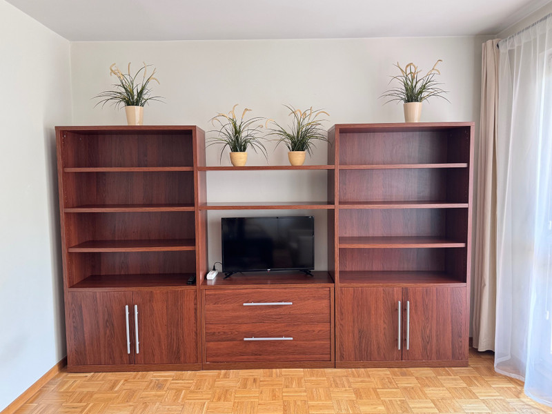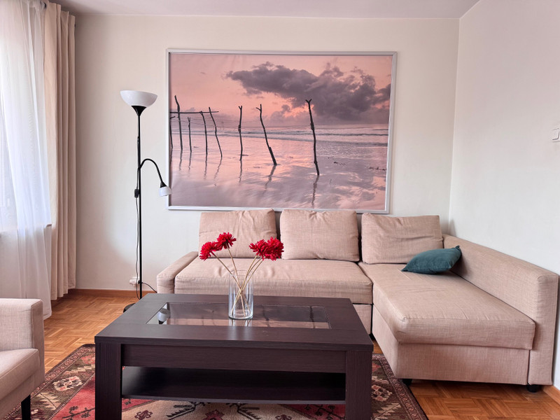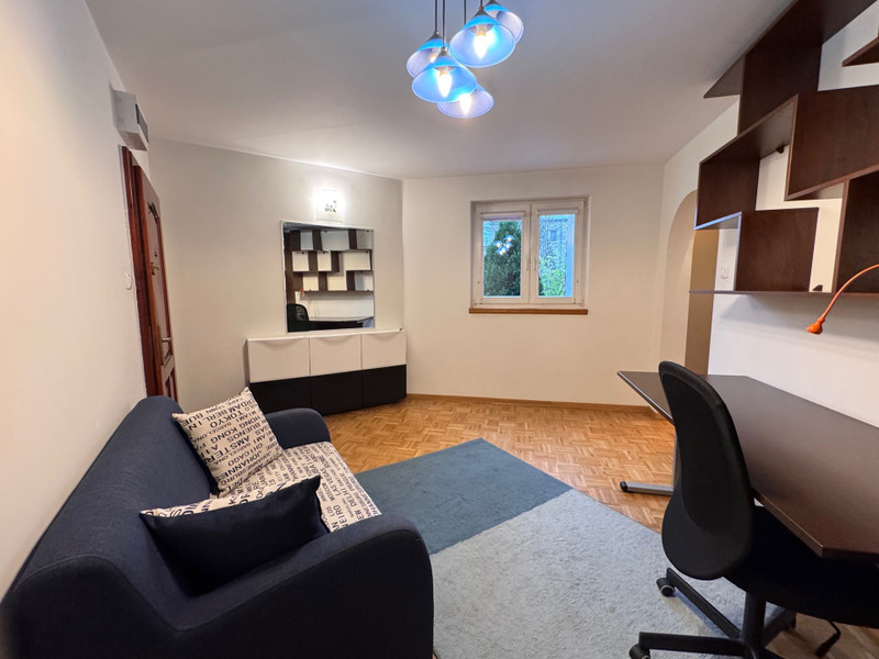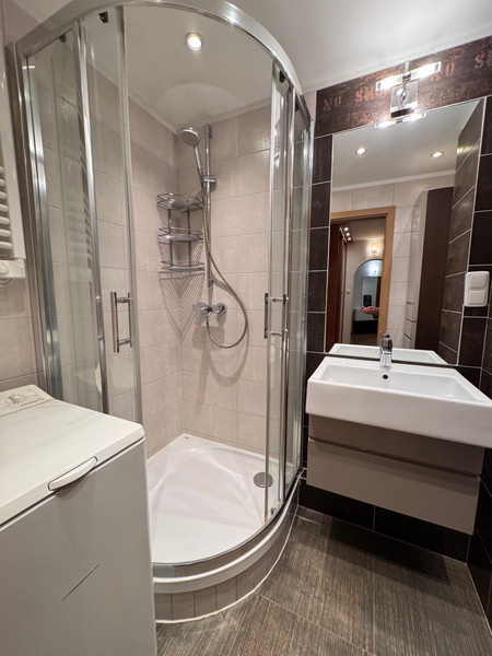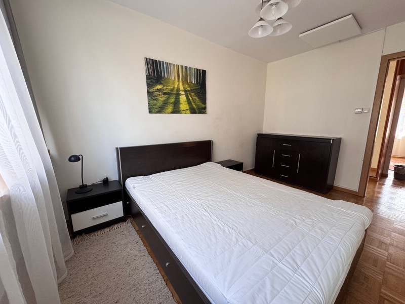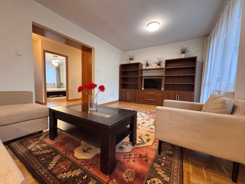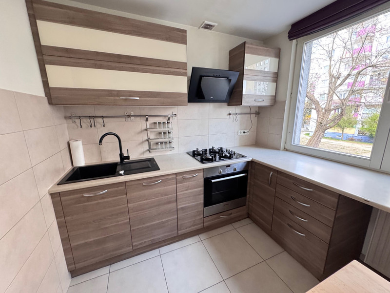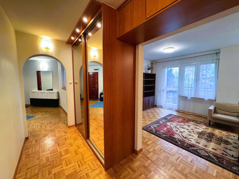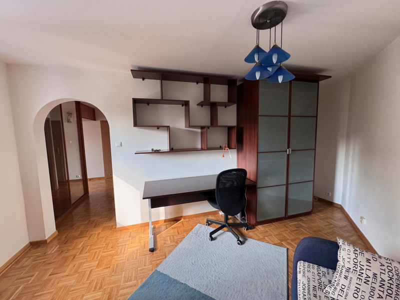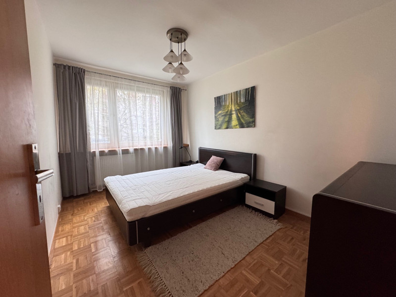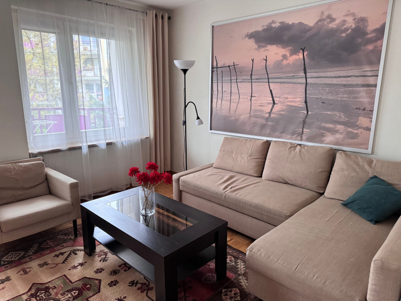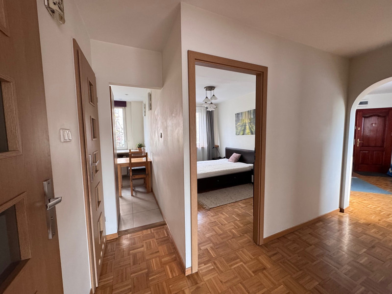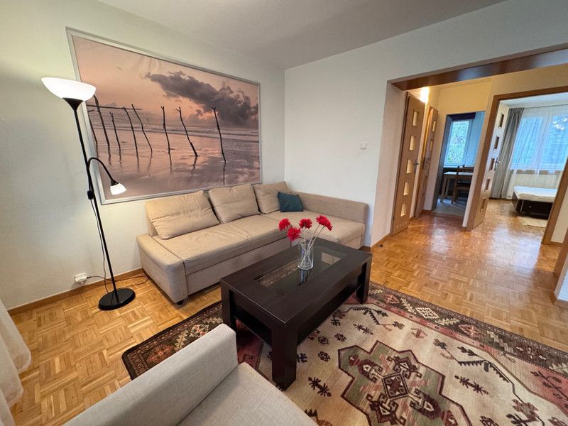 Mieszkanie rozkładowe (dwustronne), 2 pokojowe + tzw. ”trójkąt” który może być traktowany jako dodatkowy pokój, z osobną kuchnią, łazienką i WC oraz balkonem z widokiem na wewnętrzny teren osiedla. W pełni umeblowane - ewentualne doposażenie mieszkania przez właściciela nie stanowi problemu i jest do ustalenia z najemcą. Do dyspozycji jest również dość duża piwnica wyposażona w regały.