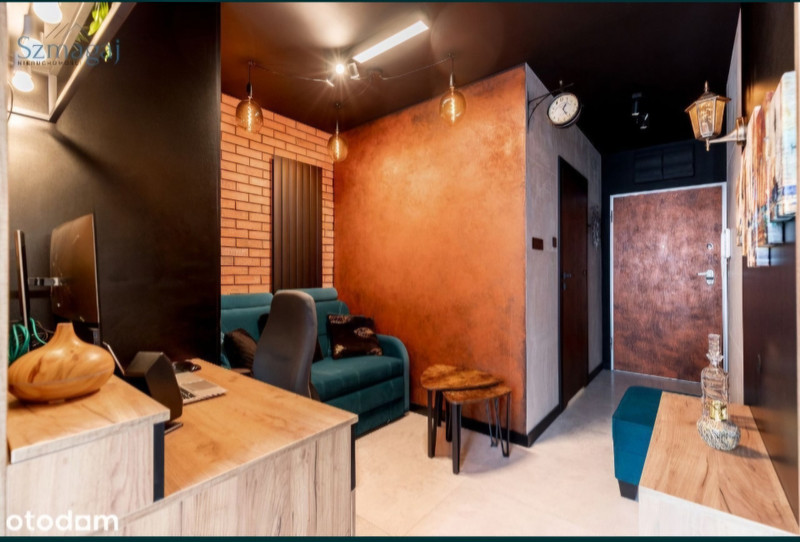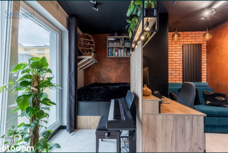 Design i wykończenie premium: Industrialno-loftowy klimat – czerwona cegła, drewno, złote dodatki, dużo zieleni i designerskie oświetlenie.